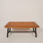 Acacia wooden coffee table with a black metal frame. The warm-toned slatted top is simultaneously sophisticated and industrial, producing a design well suited for outdoor events.