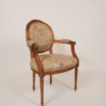 Antique gold frame Louis-style chair with muted floral upholstery. Its ornate frame and elegant pattern are well suited for a sweetheart table.