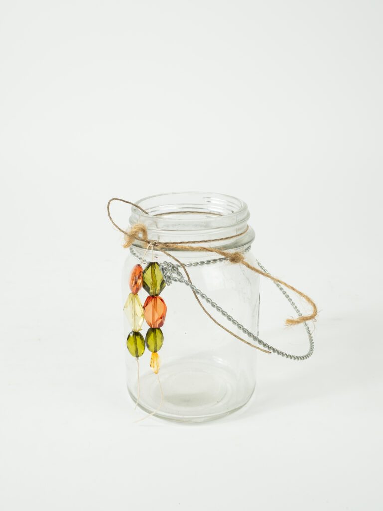 A charming clear glass preserve jar accented with decorative beads. Ideal for adding a touch of texture and style to floral arrangements, tabletop displays, or small storage.