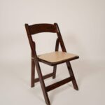 Mahogany folding chair with a padded seat. These chairs are stackable and lightweight for easy transport and storage.
