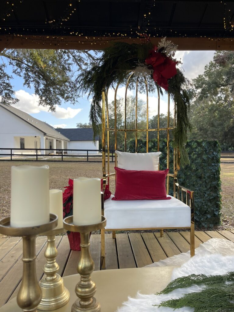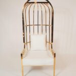 Golden metal frame canopy chair with white cushions. A traditional design enhanced with contemporary elements.