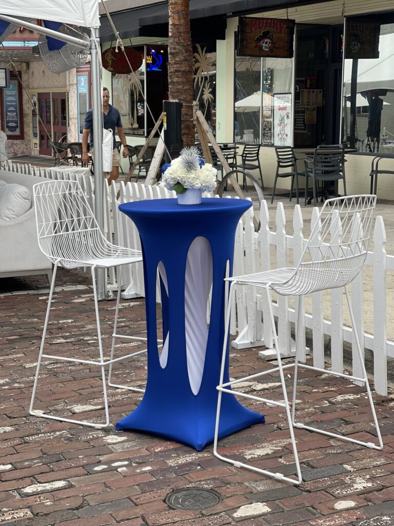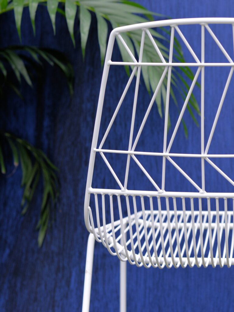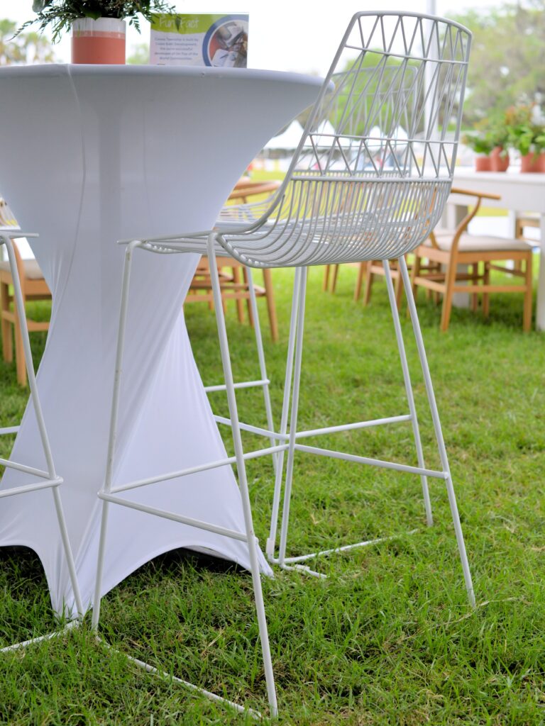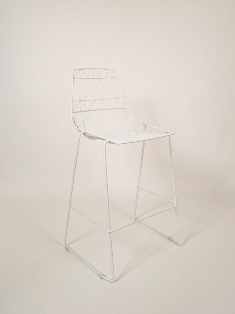 This white barstool has a sleek metal frame with an open-wire design that offers a modern aesthetic. Ideal for events, bars, and high-top seating areas, it provides a stylish yet practical seating option for contemporary spaces.