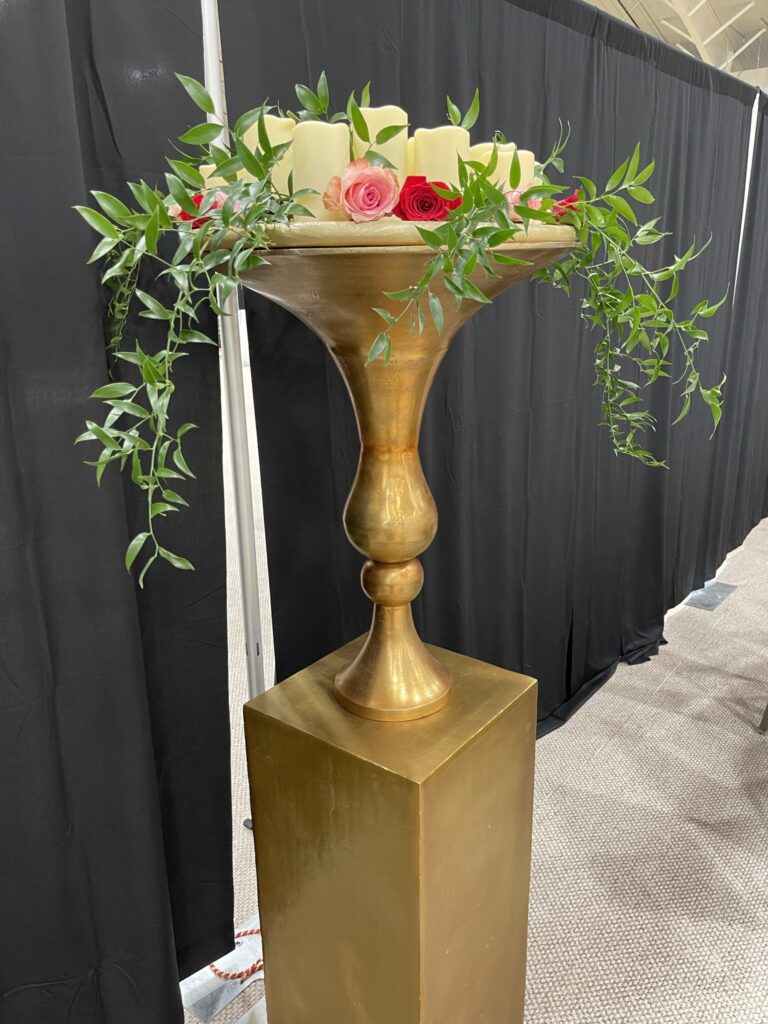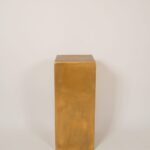 This gold pedestal features a sleek, metallic finish and a minimalist rectangular design. It serves as a versatile display piece for decor, floral arrangements, or event accents.