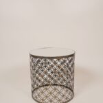 Round metal side table with a mirror top. The base of this side table features a hollow geometric design.