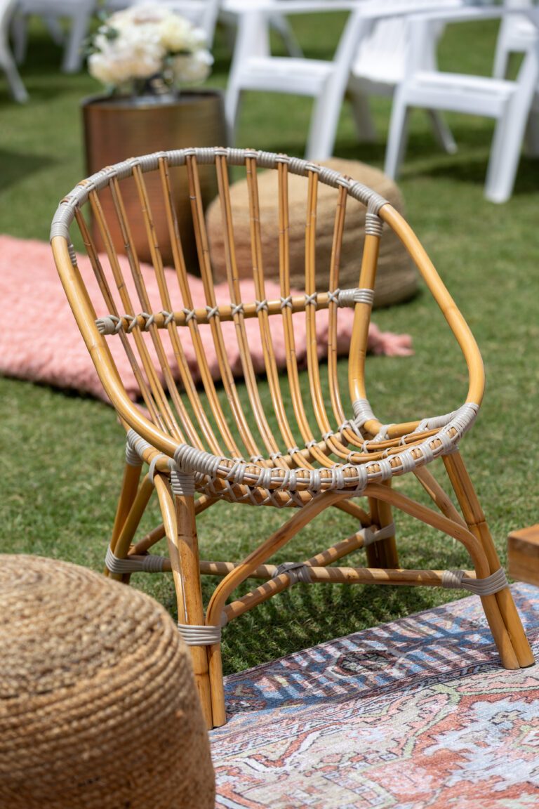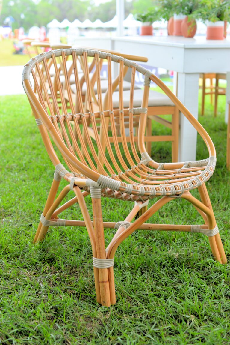 Natural rattan lounge chair featuring a unique bohemian design. Its open, airy construction and curved lines capture the essence of a true lounge chair.