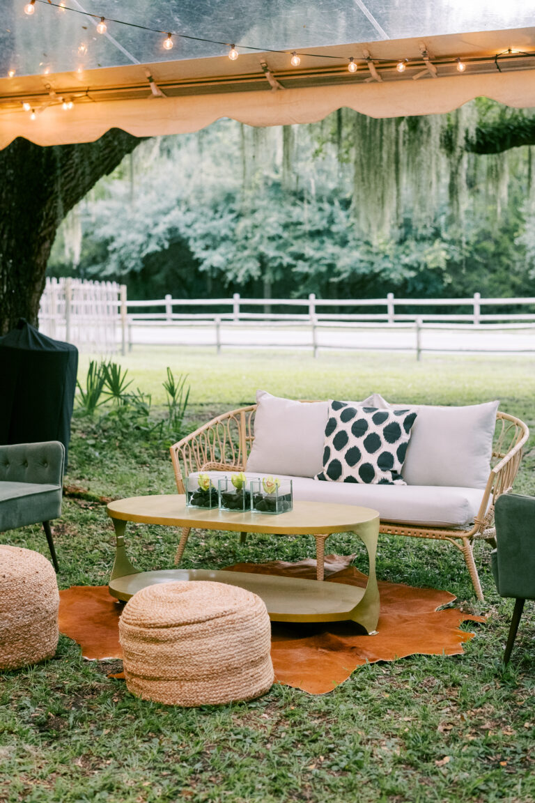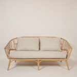 This three-seat sofa features a natural rattan frame with an open-weave design and angled armrests. It includes thick, light-colored cushions for the seat and backrest, offering a contrast to the warm-toned frame.