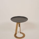 A gold and black side table with a circular base. The stand features two prongs that meet in a circular fashion, producing a balanced and dynamic design.