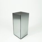 Myriad Smoke Lantern measures 10.25″ high and 4.5″ x 4.5″ at the base. It features tinted mirrored panels that are slightly see-through, creating a soft, reflective glow when lit.