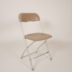 Neutral lightweight plastic chair with a metal frame. Designed for easy folding and stacking.
