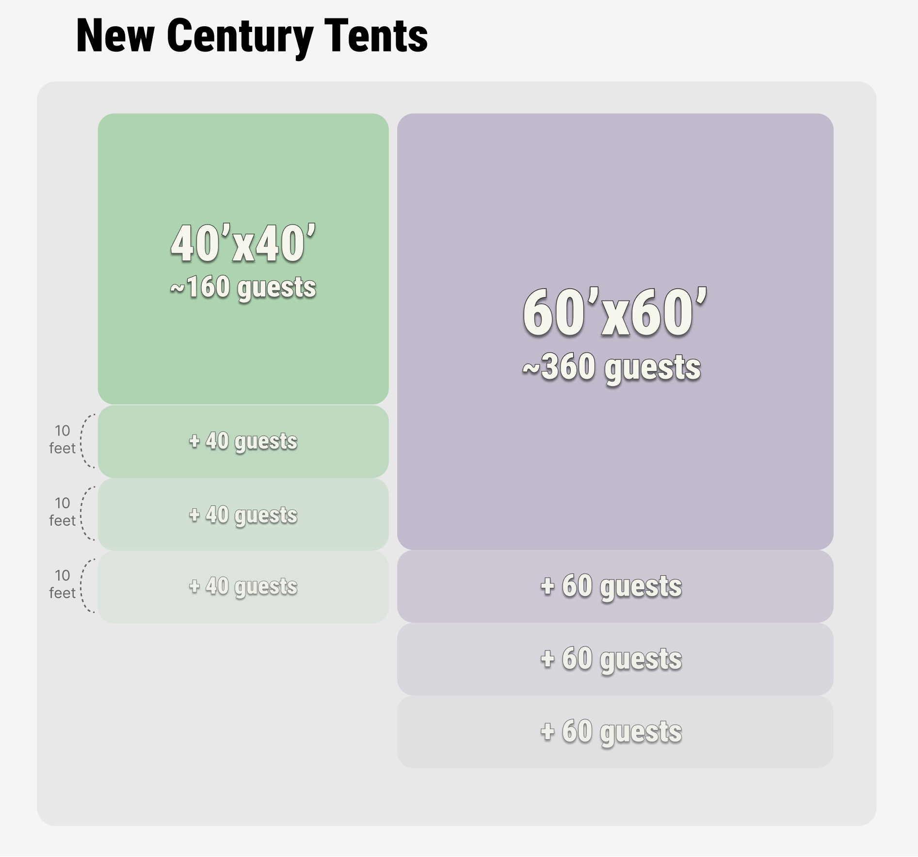 Our New Century Tents are available in 20′, 40′, and 60′ widths, each offered in multiple lengths. See our New Century Tent Size Guide to find the best fit for your event.