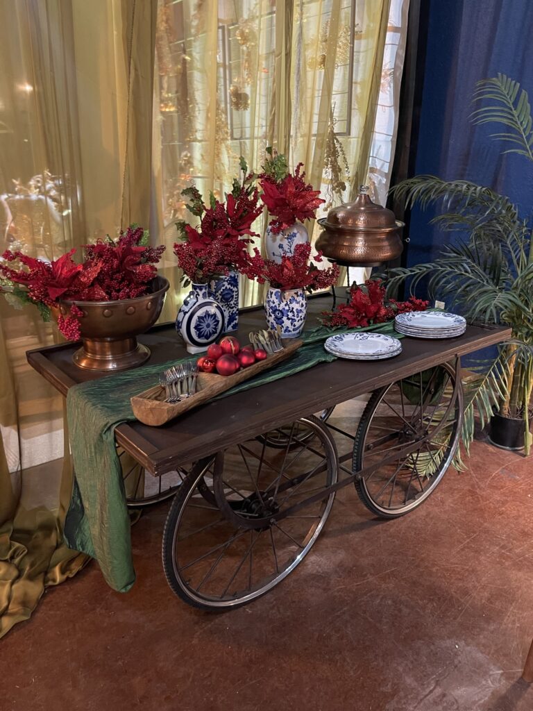 Vintage wooden cart with large wheels reminiscent of a horse-drawn carriage. Can be used for a food display, drink station, or as a functional piece for transport.