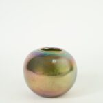This vase features a luminous, iridescent finish that shifts subtly in the light. Its compact size and eye-catching surface make it a unique accent piece for modern or eclectic arrangements.