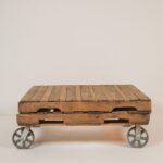 A coffee table constructed of a pallet and casters. The rustic and industrial design is well suited for outdoor events.
