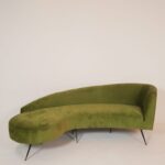 This asymmetrical sofa features a curved, organic shape with green upholstery and a built-in extended seating area. It is supported by slim, angled metal legs, giving it a contemporary design.