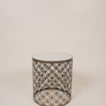 Round metal side table with a mirror top. The base of this side table features a hollow geometric design.