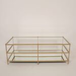 Golden metal frame coffee table featuring two sleek glass shelves and one mirrored shelf. The frame adds a touch of luxury, while the shelves create a sophisticated, layered design.