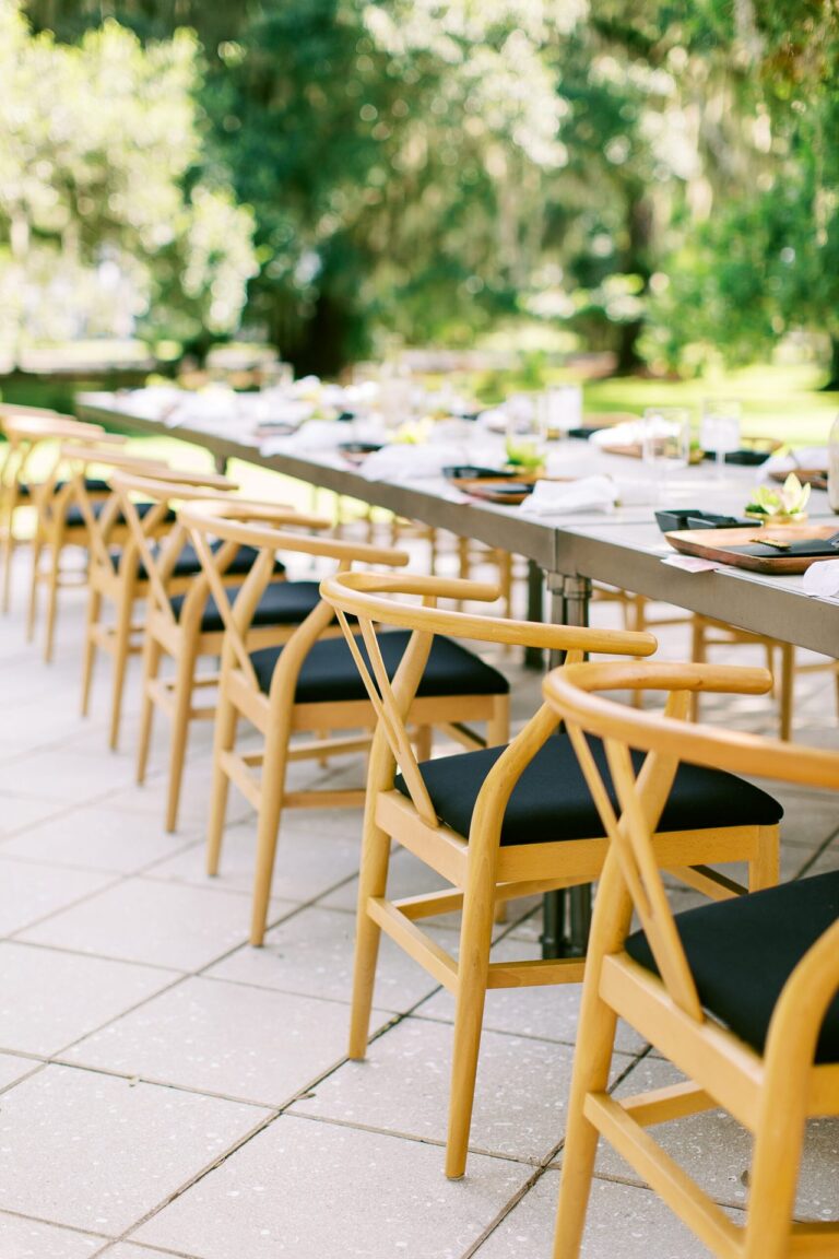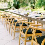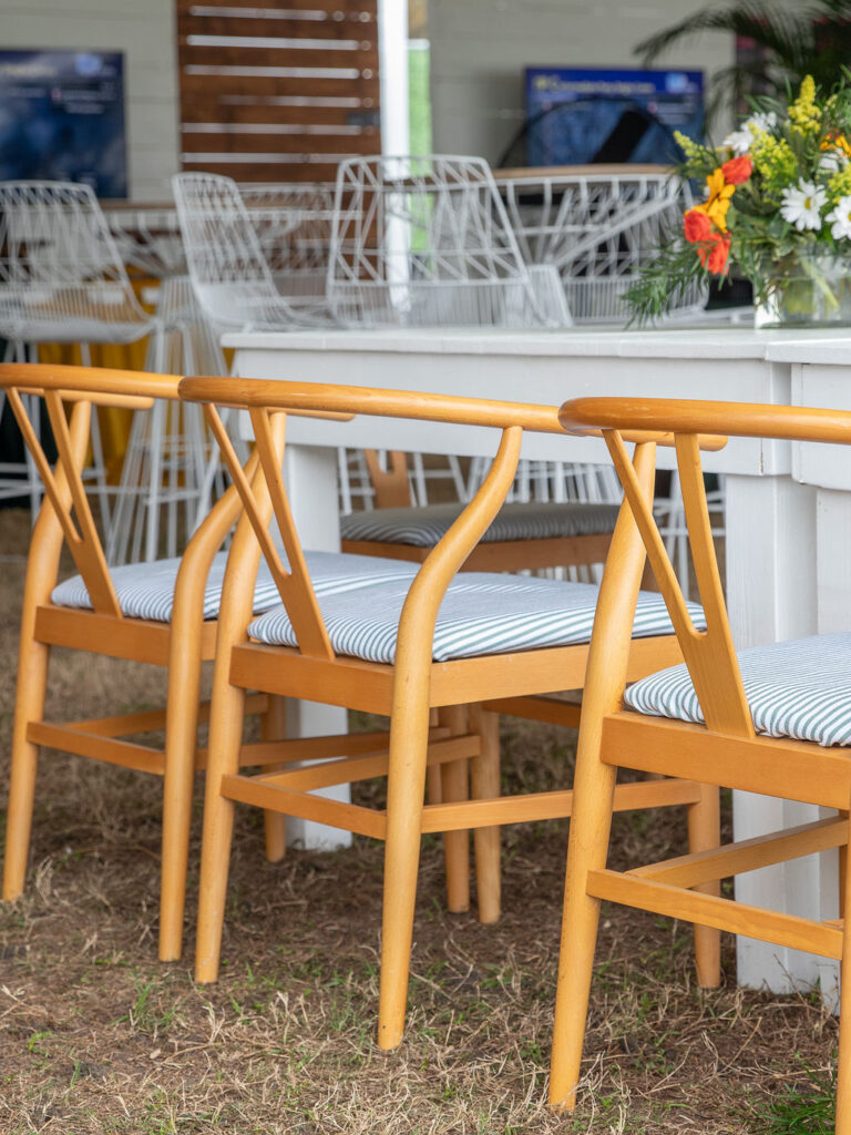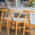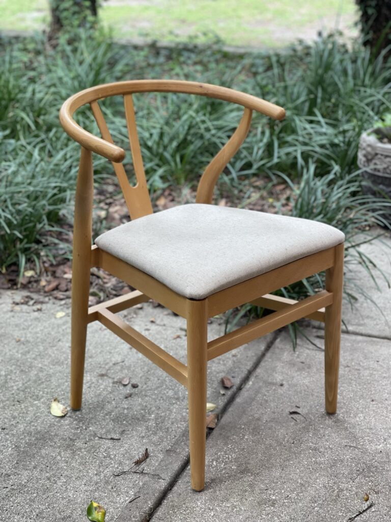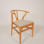 A “Y” frame wooden chair with a padded seat. The backing features sleek contours for a minimalistic and ergonomic design.